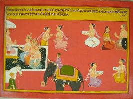 | Description / विवरण | Miniature painting based on Mahabharat - Vana parva depicting conversation between Yudhisthir and Draupadi at the upper left Draupadi is telling to Yudhisthir that in his kingdom, there is rule of Dharma and arya varta, Brahman, Guru and Gods are again respect in his kingdom. He lost his kingdom but retain dharma. at the extreme right, Yudhisthir is shown sitting with his minister in his kingdom. To their upper left, two Brahman is sharing. To its left, one sage is shown with religious text. |