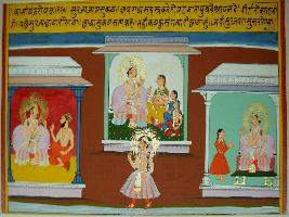 | Description / विवरण | Miniature painting based on Kashi khand depicting Surya that talking with mother and her son. the painting says that a man cannot coursed her child and look after them equally. In the left side a boy is seen that meeting Surya while a sage is seen meeting with Surya in me right side. |