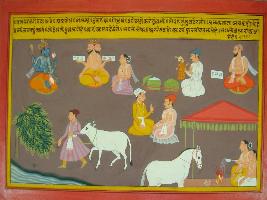 | Description / विवरण | Miniature painting based on Mahabharat - Vana parva depicting Ashwamegh, Rajsuya, Punrik and Gochav yagna, on the upper part Vishnu and Brahma is also depicted. One man is depicted here doing puppet dance and one sage seated with scriptures. |