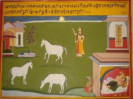 | Description / विवरण | Miniature painting based on Kashi kand depicting a man making love to a woman in his house and out side, a thief is shown making way to house at lower left. At the right a woman standing in field and roaming horses are shown. |