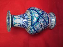 | Description / विवरण | Flower vase with globular belly, long neck and out turned rim, floral motifs are painted in white and dark blue over turquoise blue surface. |