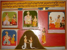 | Description / विवरण | Miniature painting based on Kashi khand depicting Sangnaya thinking about her marriage life at the middle lower part. His father is shown talking to another sage at upper left part. To the right of Sangnaya, Trilok is depicted at the upper middle part, Indra lok is shown sitting. At the extreme right, Bhulok is depicted with a man talking to his son and at lower middle part, Nag lok is depicted. |