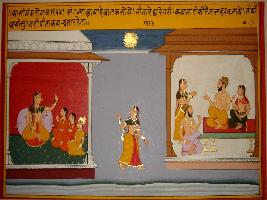 | Description / विवरण | Miniature painting based on Kashi khand depicting Sangnaya leaving his children in care of Chhaya and going to his father s house since she was not able to tolerate the sun hotness. She is shown standing in his father s house and telling her problem to him. |