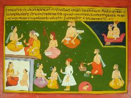 | Description / विवरण | Miniature painting based on Mahabharat - Vana parva depicting the importance of Dharma. One who full his dharma would eventually get swarg. At the lower right part, women is shown sitting with his child and telling the importance of Dharma. Above this, a sage is shown preaching to disciples. In middle painting a yogi, Brahma, sage performing yagna and meditating are depicted. At the lower middle part, a man is asking sages to shop reading. |