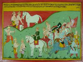 | Description / विवरण | Miniature painting based on Mahabharat - Ashwamegh parva depicting Luv and Kush make Shatrughana fainted with their arrows and captured the chariot. |