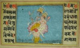 | Description / विवरण | Leaf of illustrated manuscript based on Bhagwat Gita depicting Lakshmi-Narayan sitting on their vahan Garuda. The manuscript contains illustrations on eight pages. |