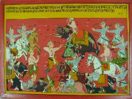 | Description / विवरण | Miniature painting based on Mahabharat - Ashwamegh parva depicting vigorous fight between Luv-Kush and Chaturangi sena for the horse of Ashwamegh. Luv-Kush are depicted destroying the army. |
