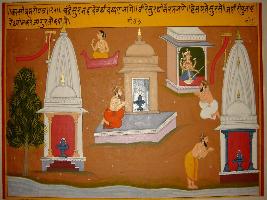 | Description / विवरण | Miniature painting based on Kashi khand depicting temple of Shiv and Goddess Bhavani and sage worshipping them. |