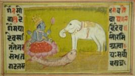 | Description / विवरण | Leaf of illustrated manuscript based on Bhagwat Gita depicting Vishnu with an elephant and a fish. This painting contains illustrations on eight pages. |