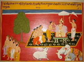 | Description / विवरण | Miniature painting based on Kashi khand depicting Brihaspati worshipping Shiv and Shiv giving boon to him. At the upper right a couple is depicted while a sage is worshipping Shiv linga depicted at the lower right corner. |