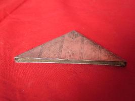 | Description / विवरण | It is a metal object used as corner used at the four ends of the bloting pad. It is made of silver and in triangular shape. It has criss-cross and wavy decoration. |