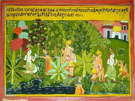 | Description / विवरण | Miniature painting based on Harivansha depicting Balram telling Yamuna to fill water on the dry land of Braj. Then after residing for long time in Braj, he moved towards Mathura. |