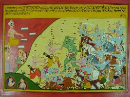 | Description / विवरण | Miniature painting based on Mahabharat - Ashwamegh parva depicting vigorous fight between army of Ram and Luv-Kush. They first fight with demon Rudhi Rakshasa and then Luv s arrow fainted 10 brave warriors viz, i Jitastra ii Mardharmik iii Saket iv Shatrusudan v Chandra vi Shalya vii Dama viii Kala ix Amal and x Singh. |