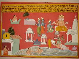 | Description / विवरण | Miniature painting based on Kashi khand depicting the importance of Prayaga. At the upper left side Brahma saying Shivsharma and his two friends that whoever gives dana, taking bath depicted at lower centre and died in Prayaga at the lower left side will get Salvation. Many temples of Prayaga is also depicted. At the upper right a man is depicted who get salvation and going to heaven. |