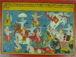 | Description / विवरण | Miniature painting based on Mahabharat - Ashwamegh parva depicting fight between Ram s army and Luv-Kush. Luv caught the hairs of Varudhi demon and attacking with sword in his hands. Kush destroyed the chariot of Lakshman. Lakshman came on other chariot on attacking on Luv-Kush. |