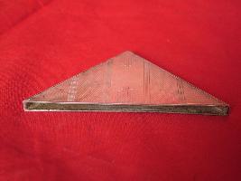 | Description / विवरण | It is a metal object used as corner used at the four ends of the bloting pad. It is made of silver and in triangular shape. It has criss-cross and wavy decoration. |