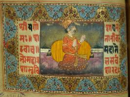 | Description / विवरण | A leaf of illustrated manuscript based on Bhagwat Gita depicting a seated king in couch. This manuscript has illustration on 26 pages. |