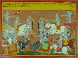 | Description / विवरण | Miniature painting based on Mahabharat - Ashwamegh parva depicting Brishketu killing the elephants of Sudhana. Sudhana attacking the army of Arjun. After that Brishketu killed the horse and charioteer of Sudhana. |