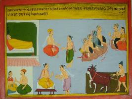 | Description / विवरण | Miniature painting based on Mahabharat - Vana parva depicting on the upper left Yudhisthir talking to his brother. At the lower left a man is ploughing the field. At the upper right a man is sleeping, next to him a man depicted giving daan. At the lower right a couple is an conversation. |