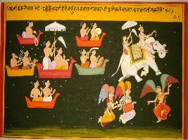| Description / विवरण | Miniature painting based on Kashi khand depicting Devtas going to Indra Lok in their yaans. Indra sitting on Airavat is leaving with them, some apsaras are seen dancing and playing musical instrument. |