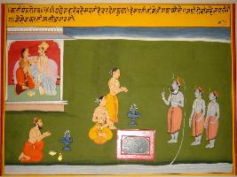 | Description / विवरण | Miniature painting based on Kashi khand depicting Mahadev talking to Brihaspati, Indra with other gods and Kinnars are seen worshipping Shiv. |