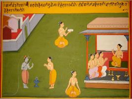 | Description / विवरण | Miniature painting based on Kashi khand depicting Mahadev telling Brihaspati that he had done hard penance, so his name will be Brihaspati. He will be the lord of Sayings. Brihaspati Lok is also depicted. |