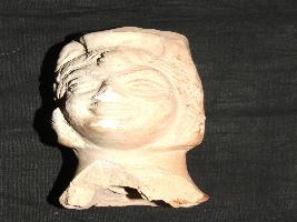 | Description / विवरण | This is a broken female head, hollow from inside. Its nose is broken. It is having an upheld projection in the form of knotted hair , wearing a head ornament. The hair at the back has been given a curved form. Chin is slightly damaged. It is also wearing ear ornaments. |