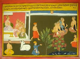 | Description / विवरण | Miniature painting based on Mahabharat - Vana parva. This painting is depicting Duryodhan sitting with his nobles and brother in his palace at upper right part. A cow is depicted outside his house with sage at lower right part. At the left part, Pandavas are shown sitting with Draupadi and discussing about Duryodhan s deed. |