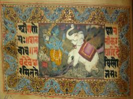 | Description / विवरण | A leaf of illustrated manuscript based on Bhagwat Gita depicting story of Gajendramoksha. This manuscript has illustrations on 26 pages. |
