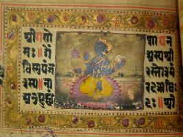 | Description / विवरण | A leaf of illustrated manuscript based on Bhagwat Gita depicting lord Vishnu, seated in Padmasan. this manuscript has illustrations on 26 pages. |