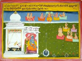 | Description / विवरण | Miniature painting based on Harivansha depicting Brahma, Indra and other gods seated in viman and coming to meet Krishna, who is sitting in his palace and attended by a chauri bearer. In the upper side, Devtas on viman are pouring flower on Krishna and apsaras are dancing. |