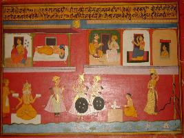 | Description / विवरण | Miniature painting based on Prithviraj Raso. Chandvardai is depicted telling about the beauty of Sanjogita to the king. On the lower part of the painting lord Brahma is depicted. |