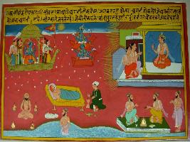 | Description / विवरण | Miniature painting based on Kashi khand depicting lord Vishnu seated on a Vayuyaan with female attendants, moving towards. Agni look on the upper part of the painting. Below it a doctor treated a patient on its left sages performing yagna, on the left corner of the painting a sage doing penance on the banks of river Yamuna. |