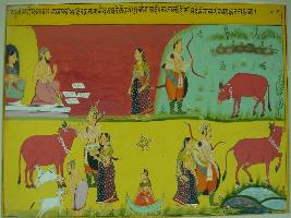 | Description / विवरण | Miniature painting based on Raghuvansha depicting and queen worshipping the cow and walking with the cow. A sage is sitting with his wife in their hermitage. |