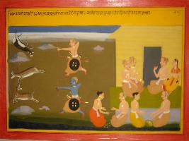 | Description / विवरण | Miniature painting based on Mahabharat - Vana parva depicting Pandavas are killing the deers and eating and playing in the Kamyaka vana. |