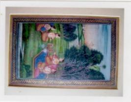 | Description / विवरण | The painting depicts two ladies sitting under the tree in a garden in a beautiful blue coloured carpet. Both are completely ornamented, earing sarees. They are pink coloured bolsters at their back. There are two other ladies sitting in front of them. The painting depicts the scene of a lush green garden with floral trees and a pond carrying pink flowers. |
