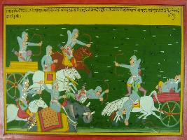 | Description / विवरण | Miniature painting based on Mahabharat - Ashwamegh parva depicting vigorous fight between Sudhana and Brishketu. Sudhana get fainted by the attack of Brishketu. |
