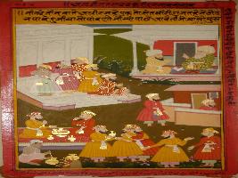 | Description / विवरण | Miniature painting based on Mullah-do-Piyaja depicting Mullah and Akbar where Mullah says things there are a man who don t get any proper place for urine ii If a guest came to home after taking meal. iii and worship of Allah for a washerman. |