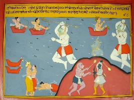 | Description / विवरण | Miniature painting based on Harivansha depicting Nikumbha Demon fighting with Gods in viman at the top right part. At the top left, God Jayant is fighting with the demon. At the lower right, Jayant is shown embracing a god. At the lower left, demon is shown fighting with Arjun. |