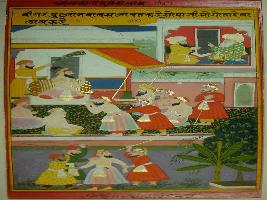 | Description / विवरण | Miniature painting depicting Akbar and Mullah-do-Piyaja talking .on the lower part in depiction of a trial in a court, gulity has been depicted suffering punishment. |