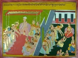 | Description / विवरण | Miniature painting based on Mahabharat - Sabha parva depicting Yudhisthir with Bhim is coming to meet Dhritrashtra and touching his feet, then goes to Gandhari with Kunti and Draupadi and touching her feet. |