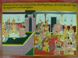 | Description / विवरण | Miniature painting based on Mahabharat - Sabha parva. The painting depicts Pandavas and Kauravas are seen sitting in their respective places and playing chaupar. The painting depicts that Yudhisthiar and Sakuni is playing chaupar. |