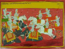 | Description / विवरण | Miniature painting based on Mahabharat - Ashwamegh parva depicting a vigorous battle where many elephants and horses are killed. |