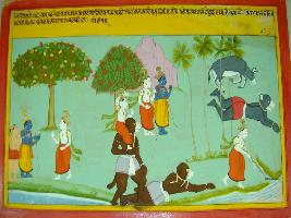 | Description / विवरण | Miniature painting based on Harivansha depicting killing of Pralambana named demon by the hands at young Balram, then killing of Drenuk named demon in Pachetal forest and the diversion of Yamuna s path his plough. |