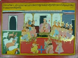 | Description / विवरण | Miniature painting based on Mahabharat - Sabha parva depicting the Sabha of Dhritrashtra, his courtiers and Pandavas who are sitting around him. Yudhisthir is depicted playing chaupar with Sakuni and he looses cows, horses and his subject in the game. |