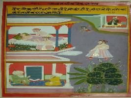 | Description / विवरण | Miniature painting depicting Akbar and Mullah-do-Piyaja talking . on the upper part a women is ill and a priest trying to treat her. |