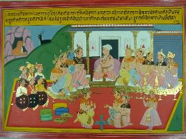 | Description / विवरण | Miniature painting based on Mahabharat - Sabha parva depicting Kauravas and Pandavas are sitting in the court including Bhishma and Dhitrastra while Yudhisthir is playing chaupar with Sakuni and Duryodhan and he lost many arthas . |