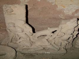 | Description / विवरण | It is a sculpture which broken middle part. Middle part of sculpture had broken only left broken feet is shown. A male is lying nude below the feet. A nimal is shown back part of the sculpture. A male and female attendant is shown right side the main s |