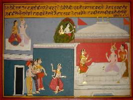 | Description / विवरण | Miniature painting based on Prithviraj Raso. Indra is depicted sitting with his wife, some women are depicted playing musical instruments and dancing. On the other side Prithviraj is depicted sitting and two women are attending him. |