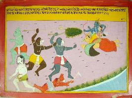 | Description / विवरण | Miniature painting based on Harivansha depicting war between Krishna and demon Narkasur. He send demon Maru with trident to kill Krishna but killed by him. Later many demons attacking on Krishna with trees and other weapon and Krishna killed many of them while some of them are running away. |